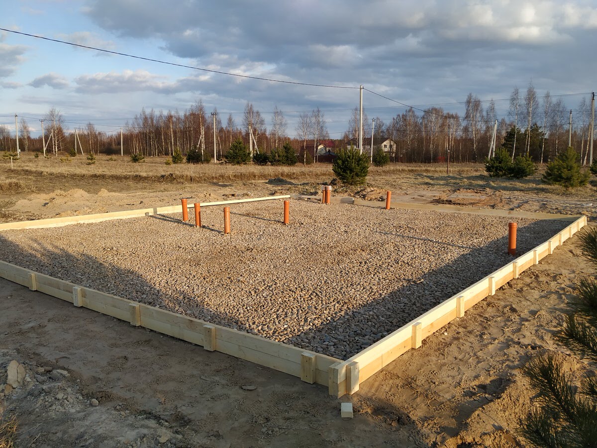 Перед началом работ нужно очистить участок от мусора, установить обноску для обозначения осей будущего дома. Затем выполняется копка котлована со снятием плодородного слоя почвы.