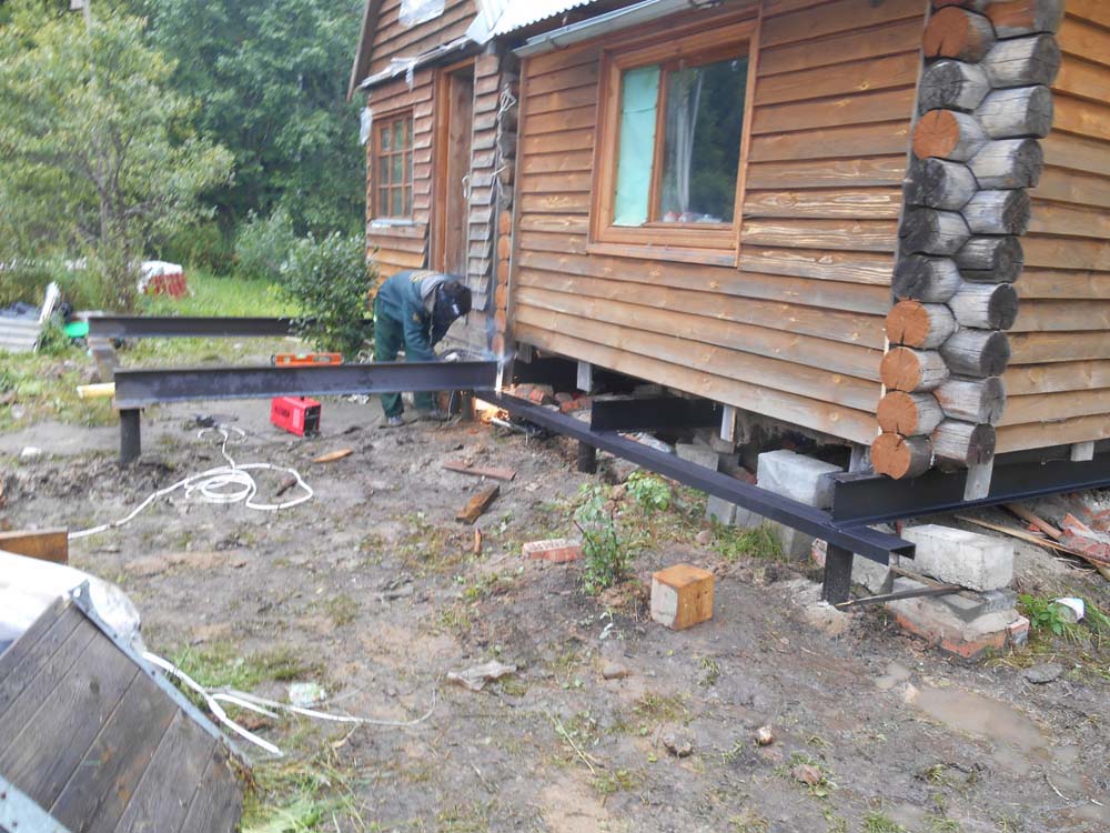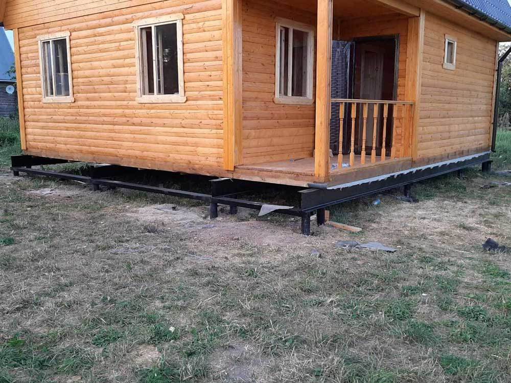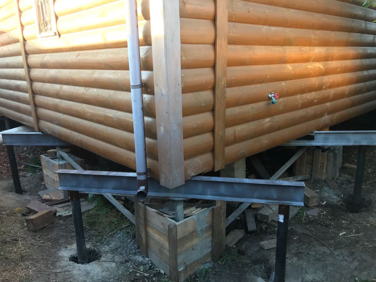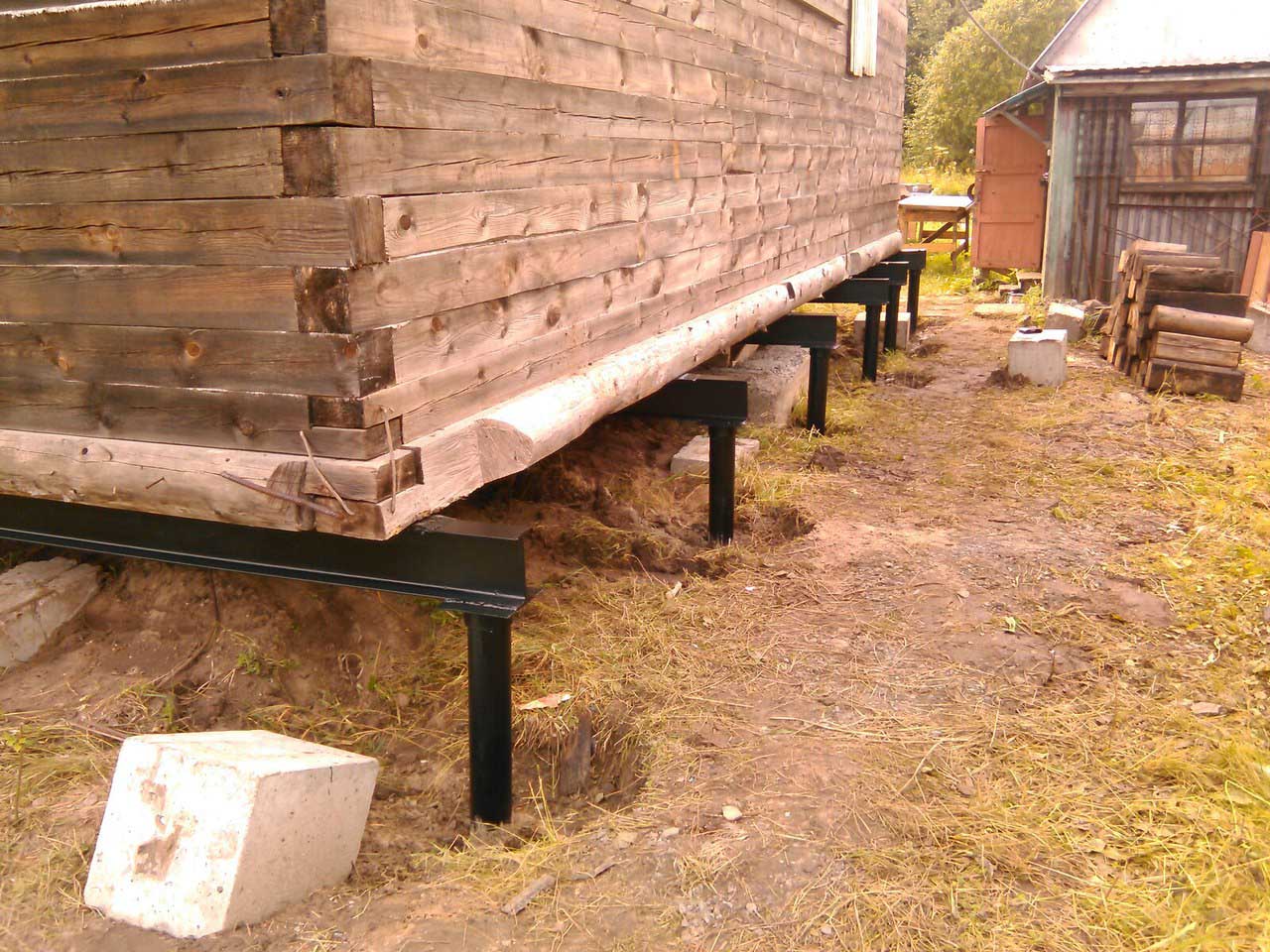 Поэтапно поднимаем дом на расчетную высоту с помощью домкратов.